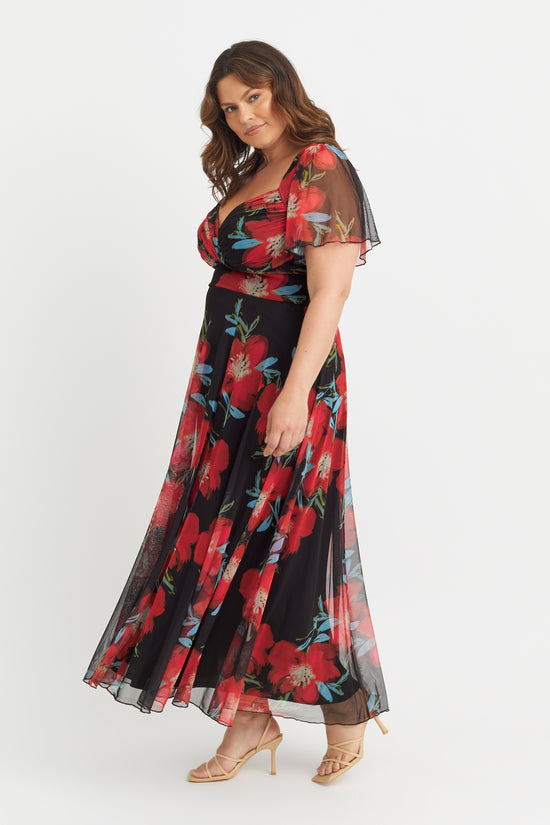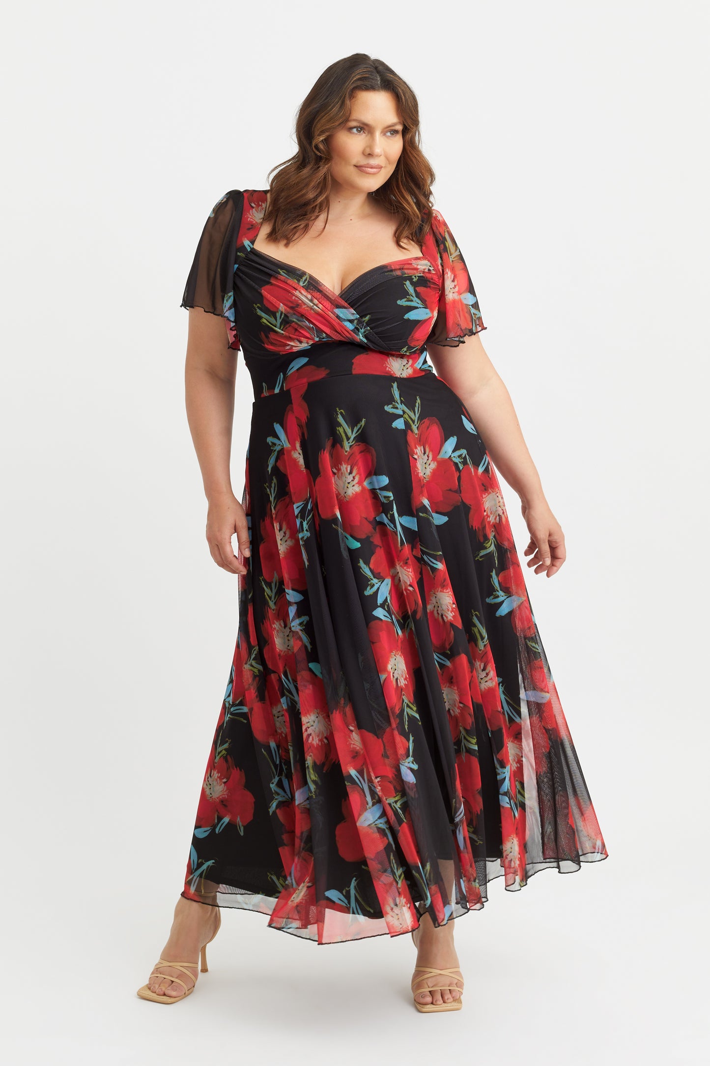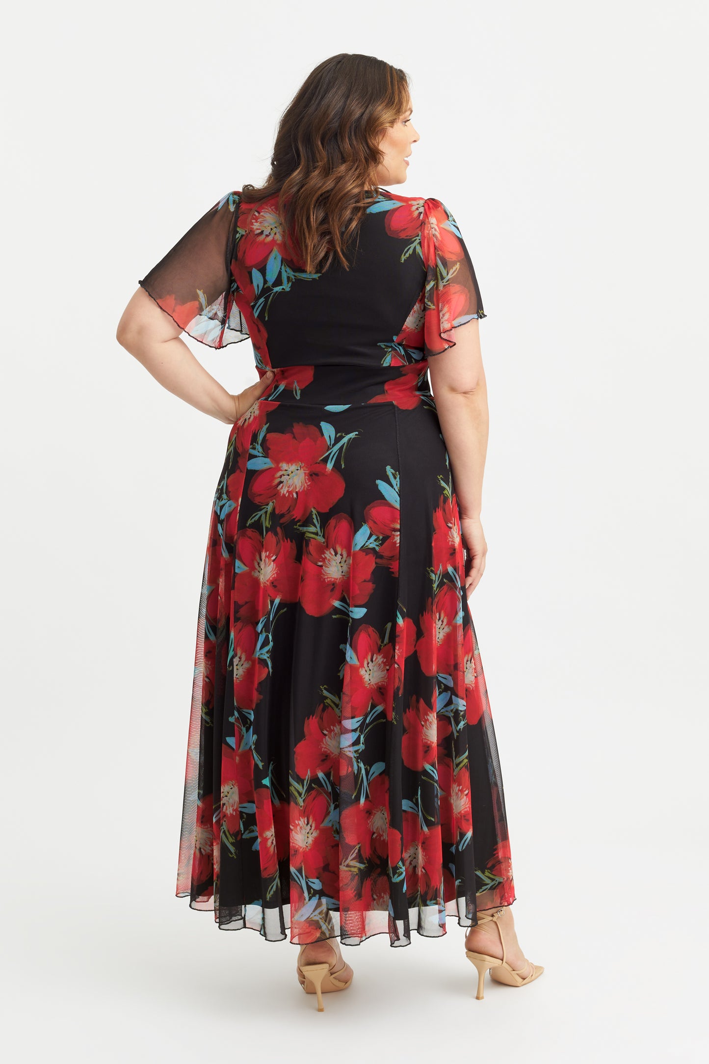 The Kemi Scarlet Black Print Bolero Wrap Bodice Maxi Gown features a gorgeous, daring low-cut, wrap bodice adorned with a scarlet black print that the photos just can not capture. Featuring floaty angel sleeves, and a sweetheart neckline. The elasticated magic waistband enhances your figure. Perfect for any occasion, this is a truly sensational maxi dress with wrap sweetheart neck line . Please note there are detachable shoulder pads that elongates as per your preference.