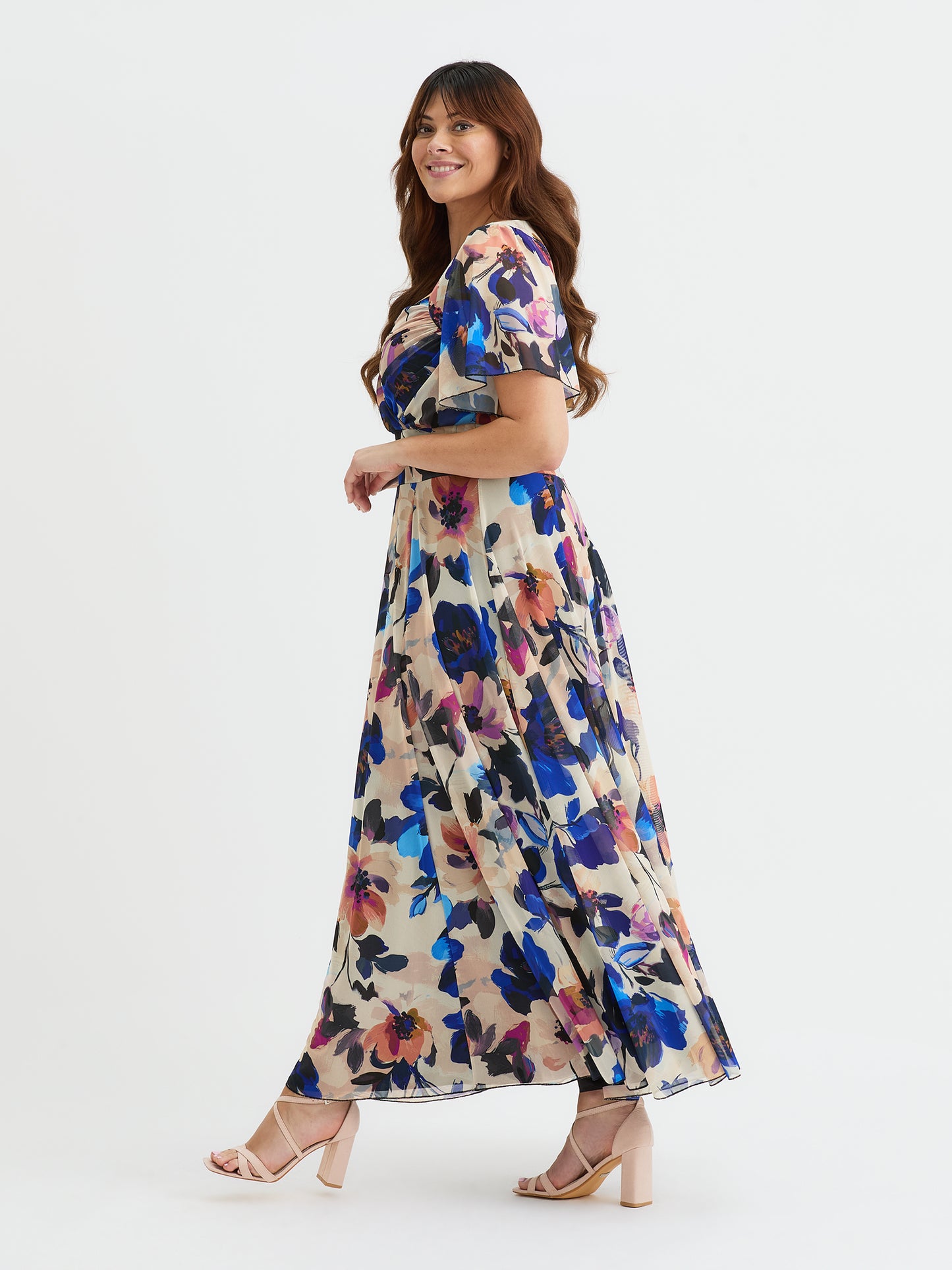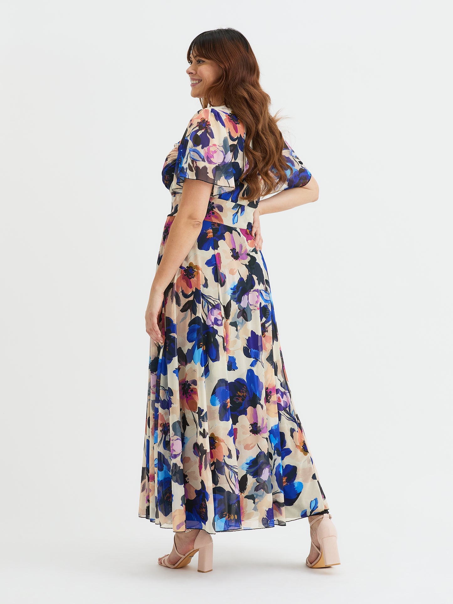 The Kemi Vintage Blue Multi Bolero Wrap Bodice Maxi Gown features a beautiful floral print,  a gorgeous, daring low-cut, wrap bodice featuring floaty angel sleeves, and a sweetheart neckline. The MagicBand® enhances your figure. Perfect for any occasion, this is a truly an all time classic maxi dress with wrap sweetheart neck line. Crafted in Powerfit® mesh a fabric that breathes and is fully lined. Please note there are detachable shoulder pads that elongates as per your preference.
