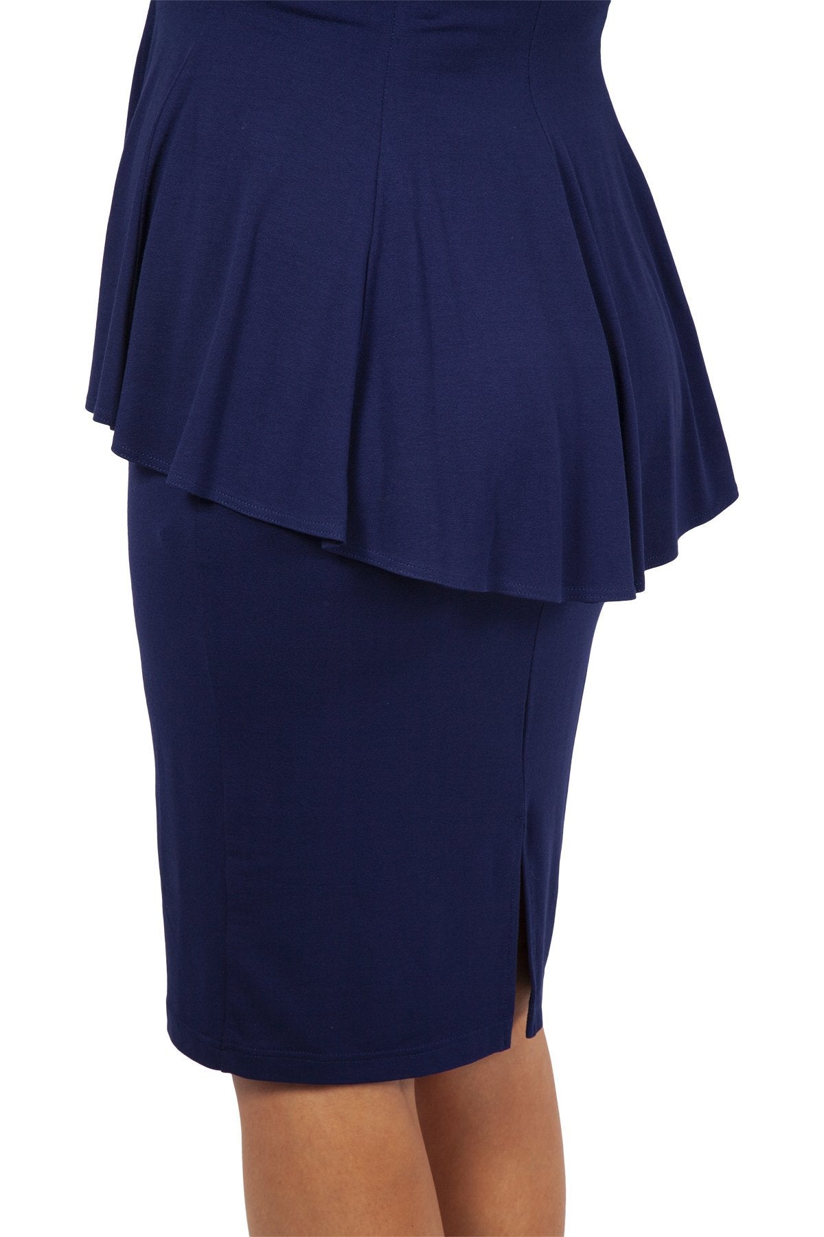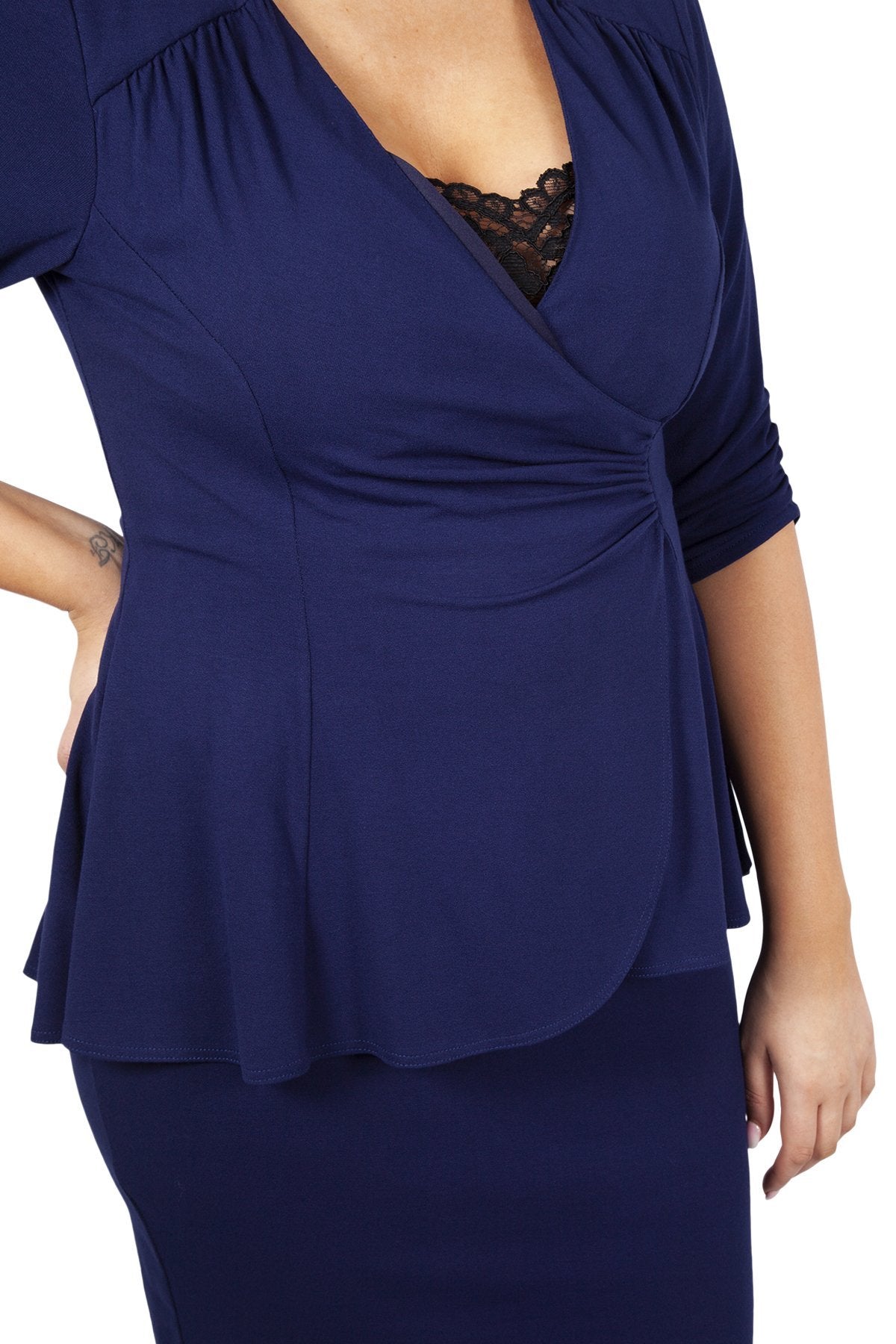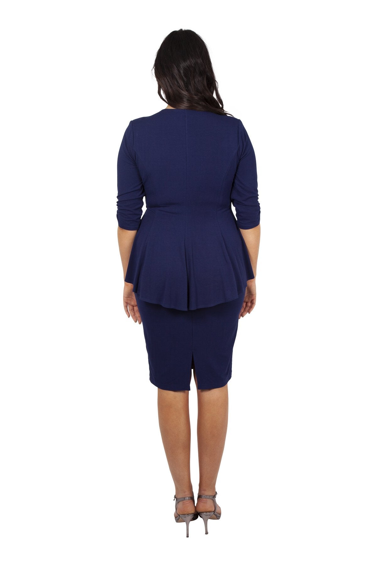 Really flattering, Scarlett & Jo's small shoulder pads elongate the body in classic 1940's tradition. The shaping comes from the beautifully tailored inner lining with a little modesty lace insert. The peplum is a twist wrap with gentle side pleats, a nod to the 1949 Dior skirt, making for a very smart one-piece dress suit. This dress is finished with a beautiful 3/4 ruched sleeve.