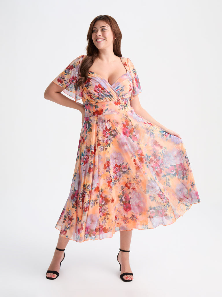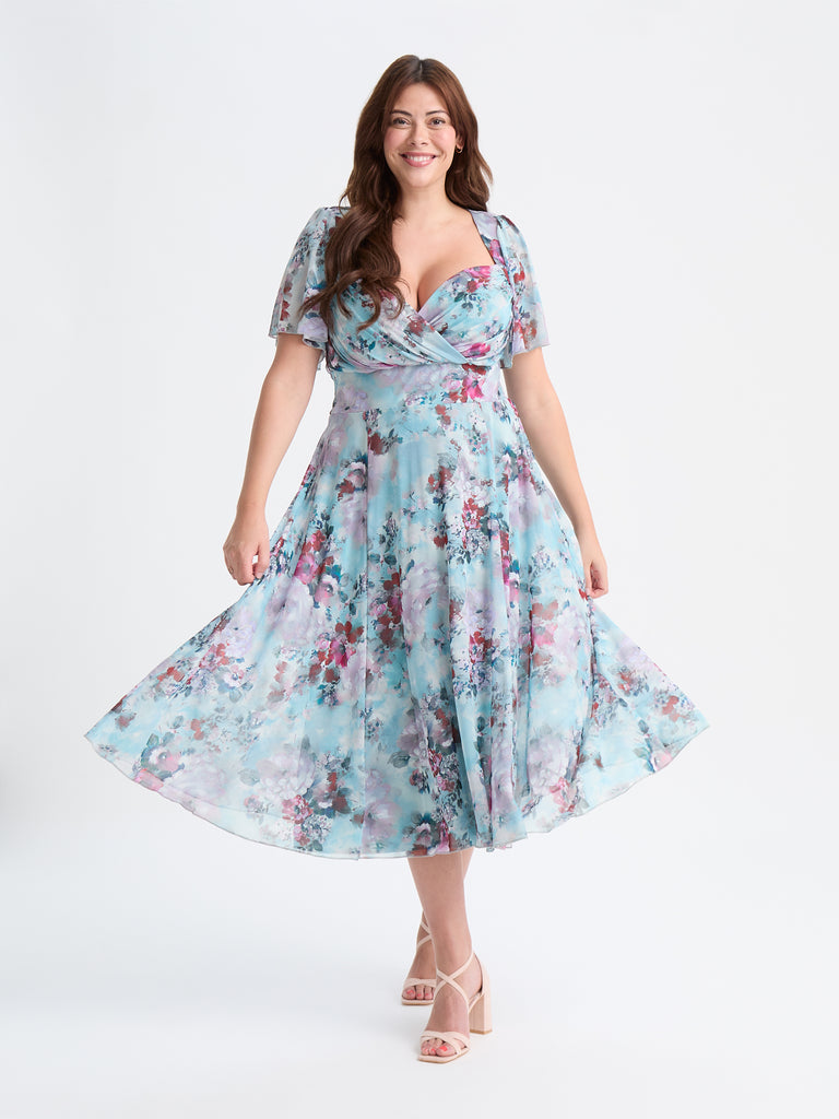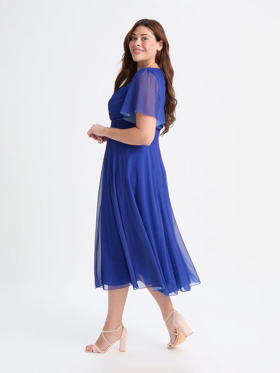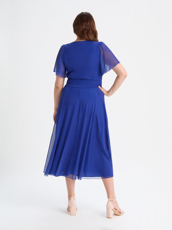 The Liz Solid Sapphire Bolero Wrap Bodice Midi Dress features a gorgeous, daring low-cut, wrap bodice featuring floaty angel sleeves, and a sweetheart neckline. The MagicBand® cinches you in and enhances your figure. Crafted from our super soft POWERFIT® mesh that falls and drapes elegantly. Perfect for any occasion, this is a truly sensational midi dress with wrap sweetheart neck line. Please note there are detachable shoulder pads that elongates as per your preference. Petite Friendly Fit.