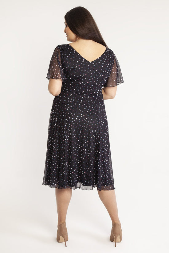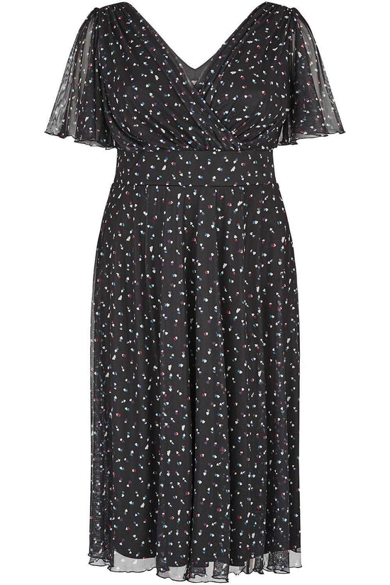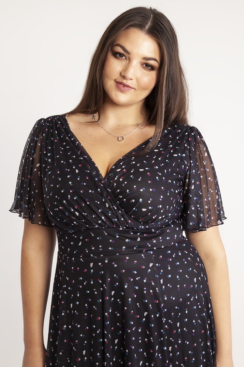 The Victoria Heart Angel Sleeve Midi Dress made in a super soft stretch mesh features a cute mini heart print in a fabric that breathes. This dress comes with a magic waistband, in-built corset to help accentuate curves and brings out that unique Scarlett and Jo hourglass shape. The deep V-neck creates a flattering feminine silhouette and the angel sleeves provide upper arm coverage. This is a perfect dress that you can wear to any event.