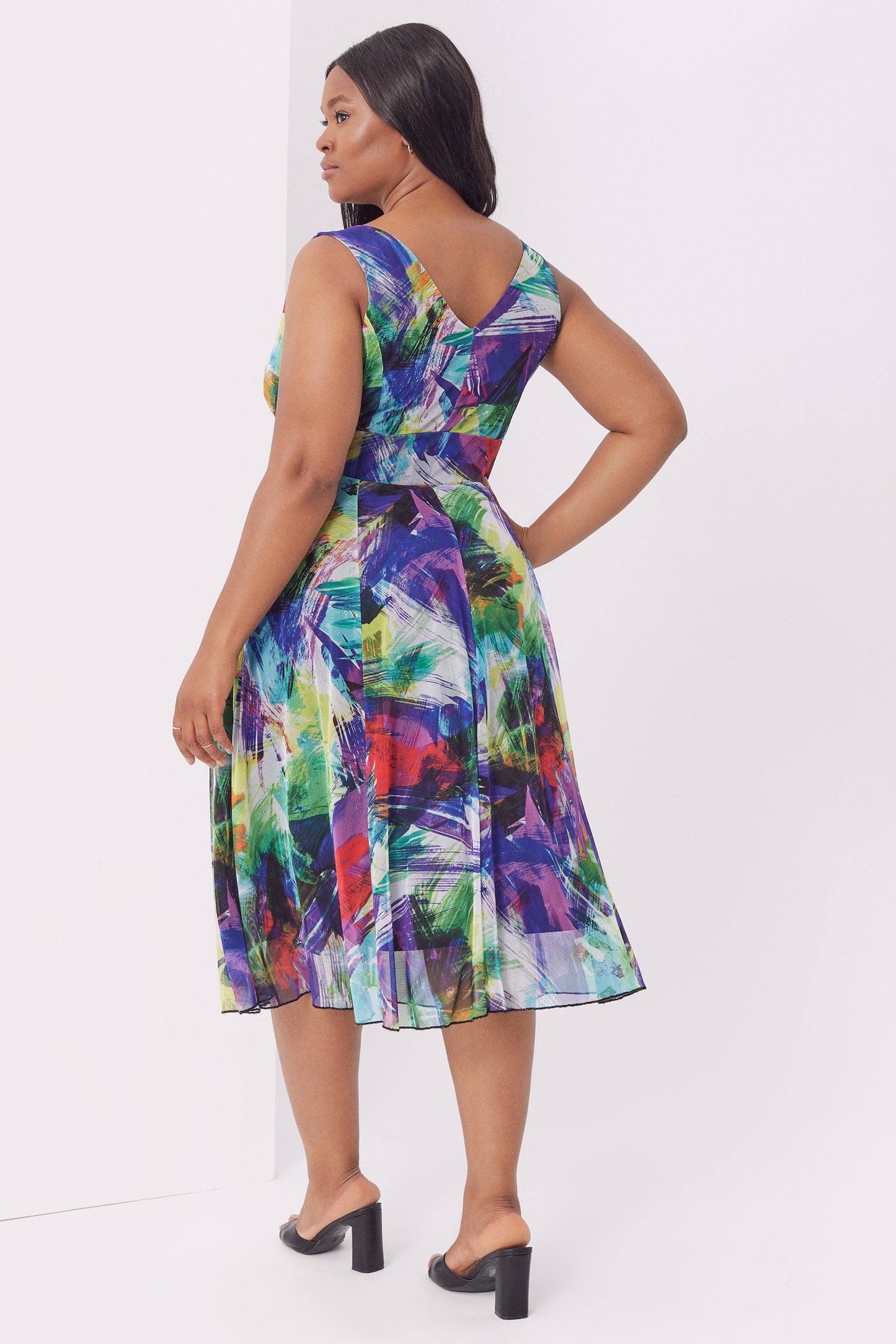 Scarlett & Jo's vintage charm dress will leave hearts head-over heels. Elegantly shaped, delicious and delicate, this stylish piece is decorated in a multi coloured "brush stroke" print on a soft white background. This dress is fully lined in a black lining and features a magic waist band to cinch you in and a full skirt, creating a fluid silhouette. Finished with an appealing v wrap secure neckline, sleeveless and a demure mid-length. Can be teamed up with many shoes and accessory colours.