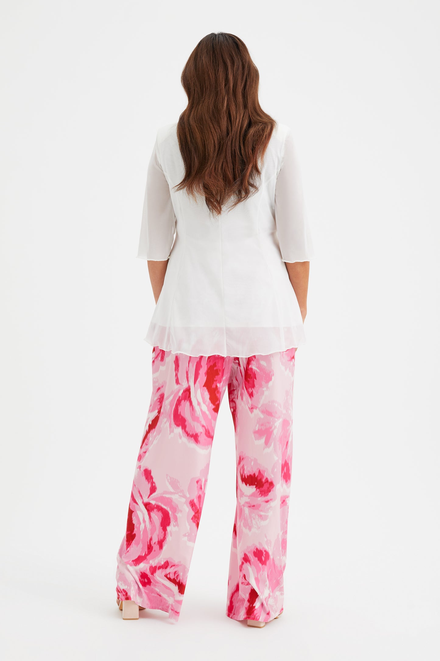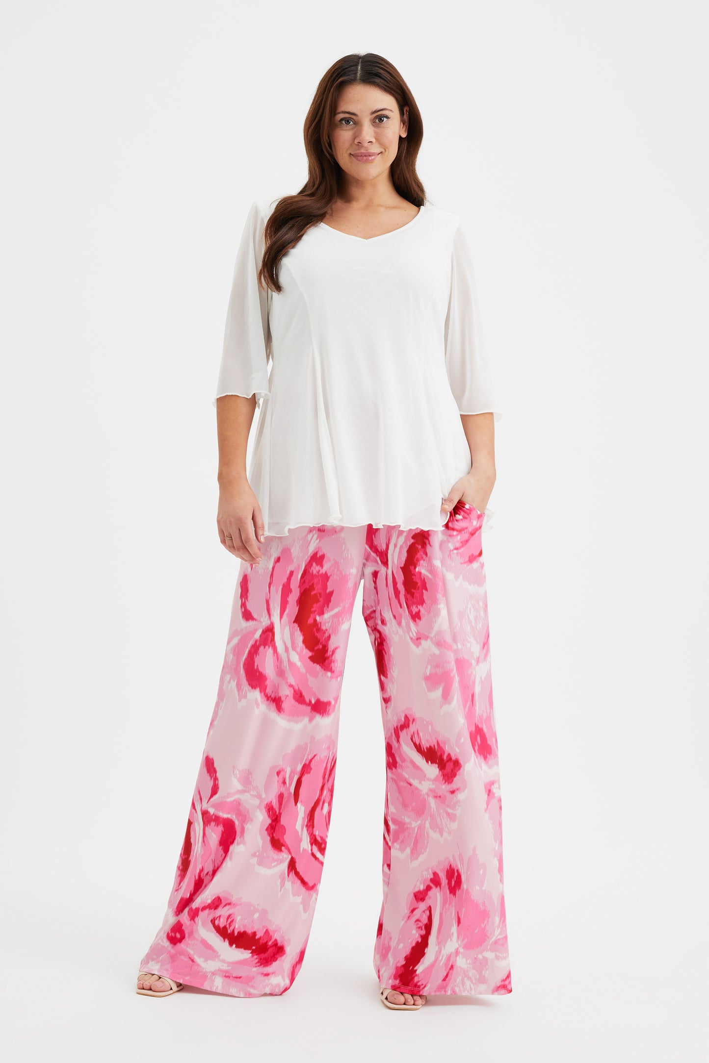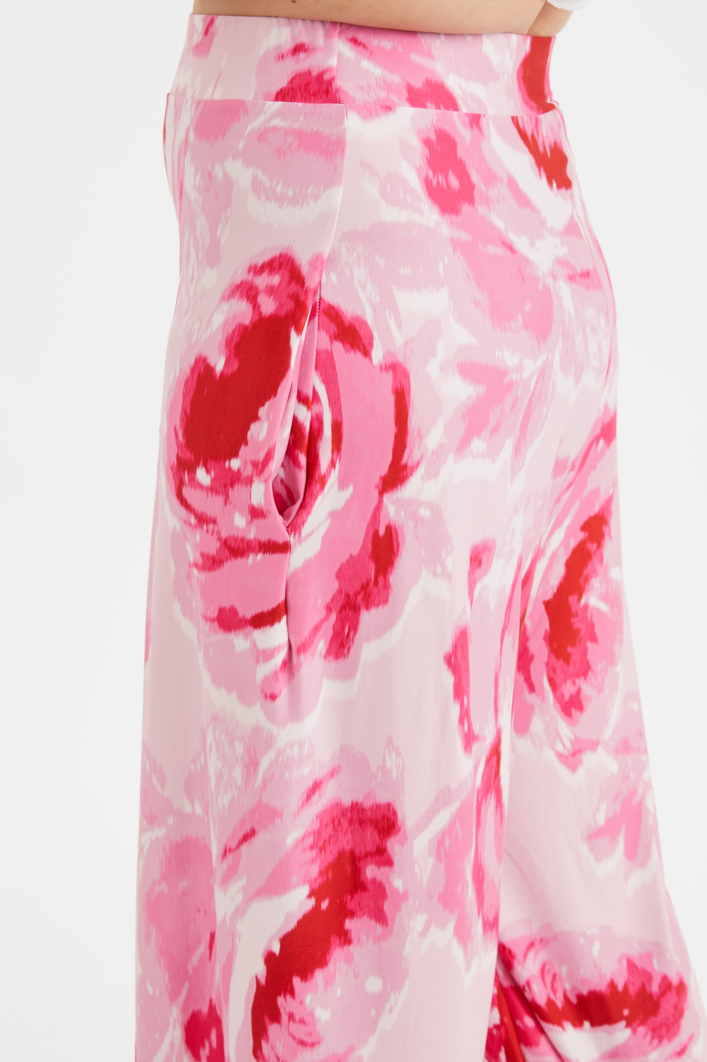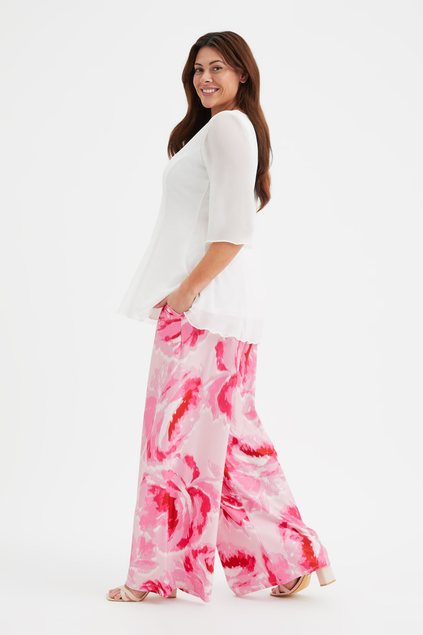 A fresh addition to your work-wear this season, this print wide leg pant The high rise design adds extra fit and comfort. Crafted from our POWERFIT® special peach touch jersey with MagicBand® and side pockets. This print Bette version has no sides seams and does feature side pockets, A great lounge pant that can be dressed up or down.