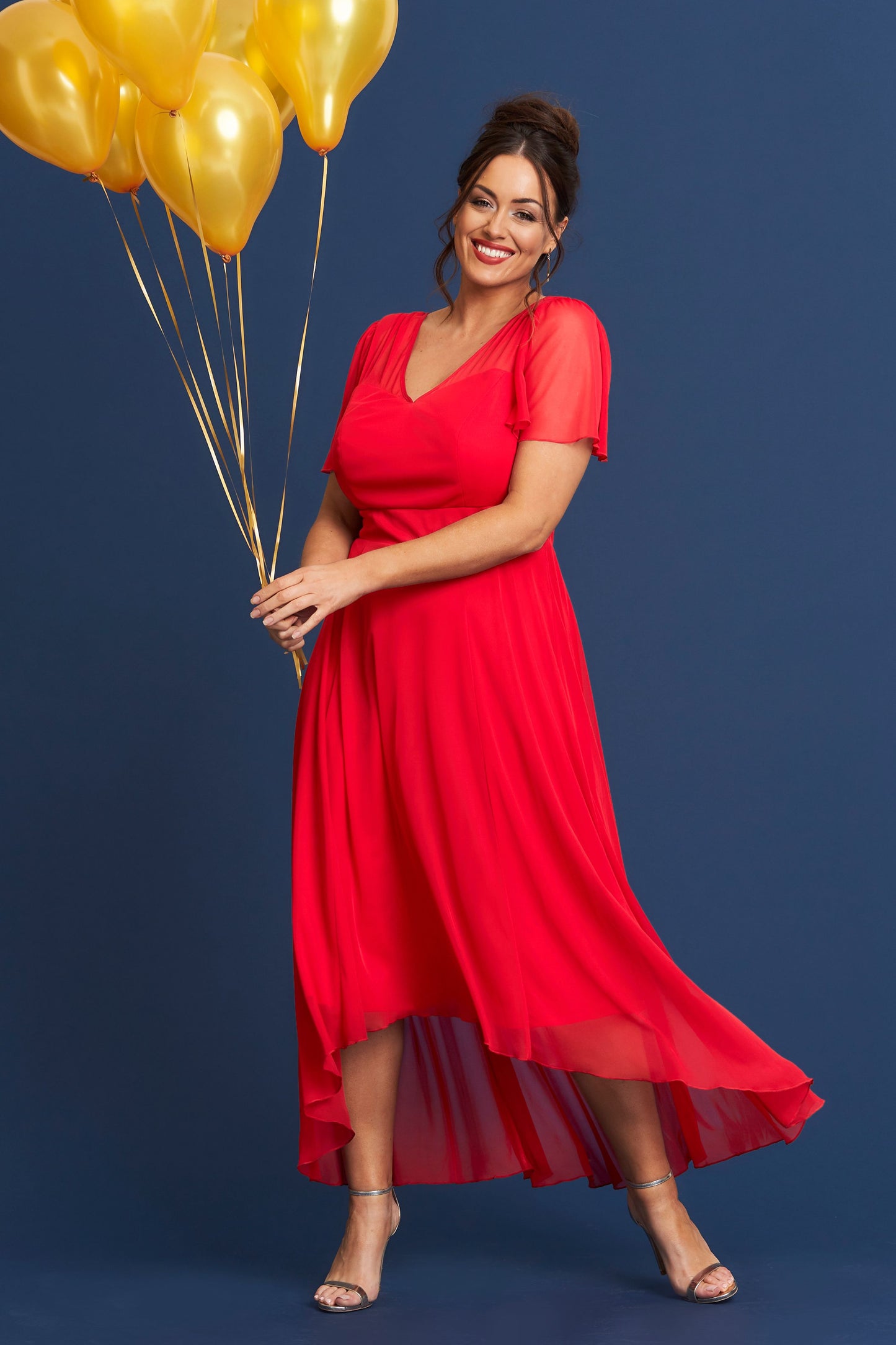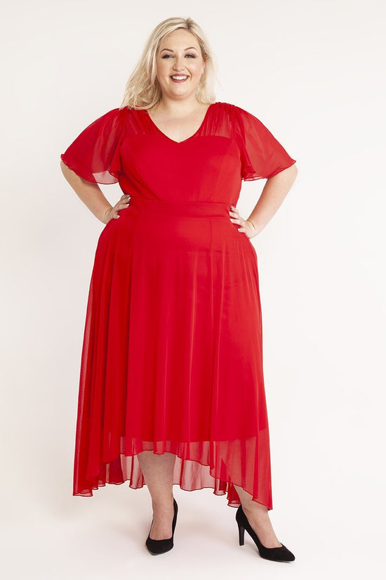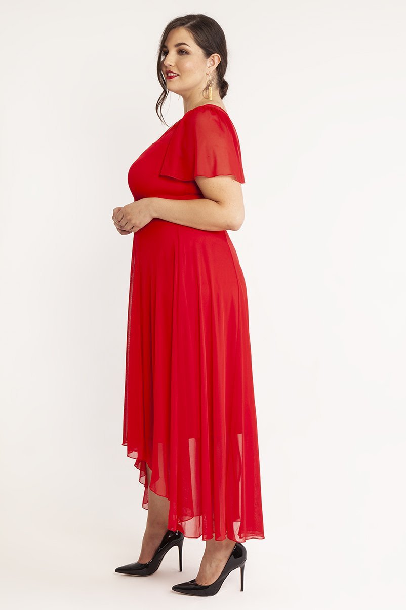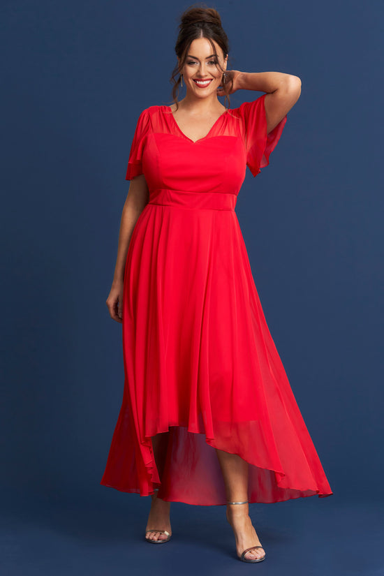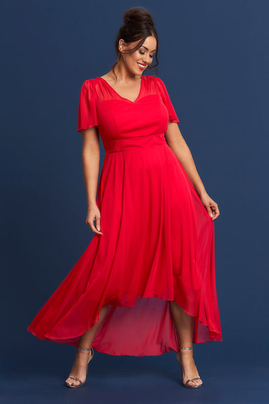 Treat yourself to our gorgeous Tilly Hi-Lo Dress. With sweetheart front detail and a V neckline this stunning dress features a gathered 1940s shoulder line and pretty angel sleeves to give upper arm coverage. Designed with our inbuilt corset magic waistband to give you that unmistakable Scarlett and Jo silhouette so curves are elegantly accentuated and hidden support is provided. The beautiful dress skirt drapes gracefully to the ground with a Hi-Lo effect. Perfect for any social event from wedding guest dress to prom dress to party dress.