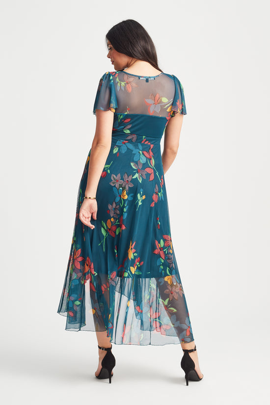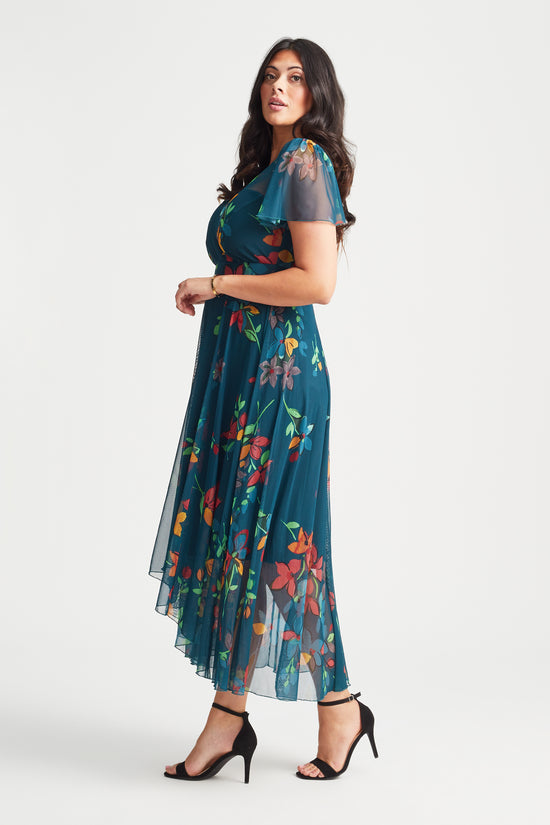100's of women were introduced to Scarlett & Jo through the original. Treat yourself to a gorgeous updated print Tilly Hi-Lo Dress. With a V front and shaped lined  sweetheart detail. This is a stunning fully lined dress that does not disappoint with its signature print. The dress that is designed to breathe, features a gathered 1940s shoulder line and pretty angel sleeves to give upper arm coverage. Designed with our inbuilt mini-corset magic waistband to give you that unmistakable Scarlett and Jo silhouette so curves are elegantly accentuated and hidden support is provided. The beautiful dress skirt drapes gracefully to the ground with a Hi-Lo effect. Perfect for any social event from wedding guest dress to prom dress to party dress.