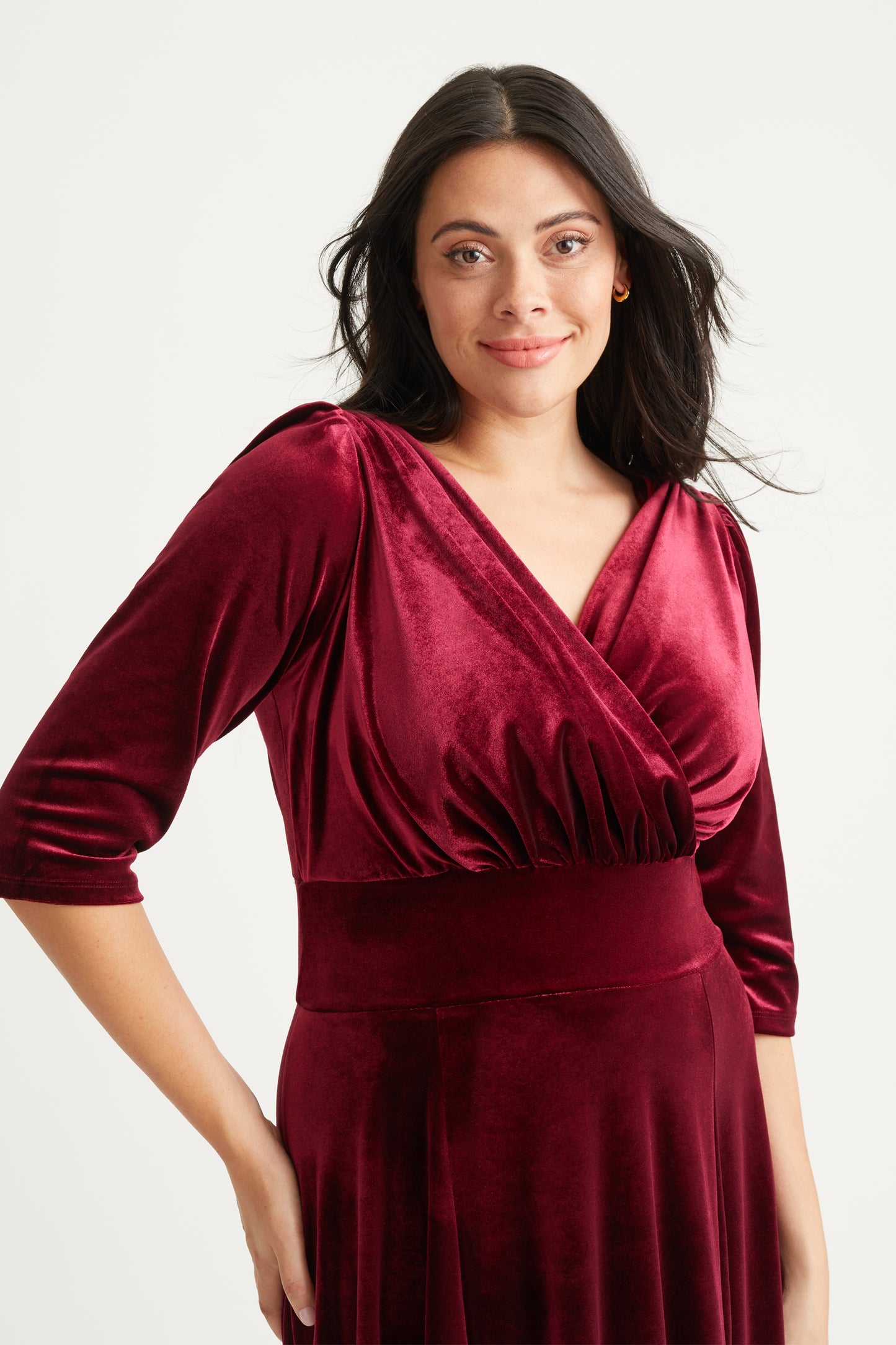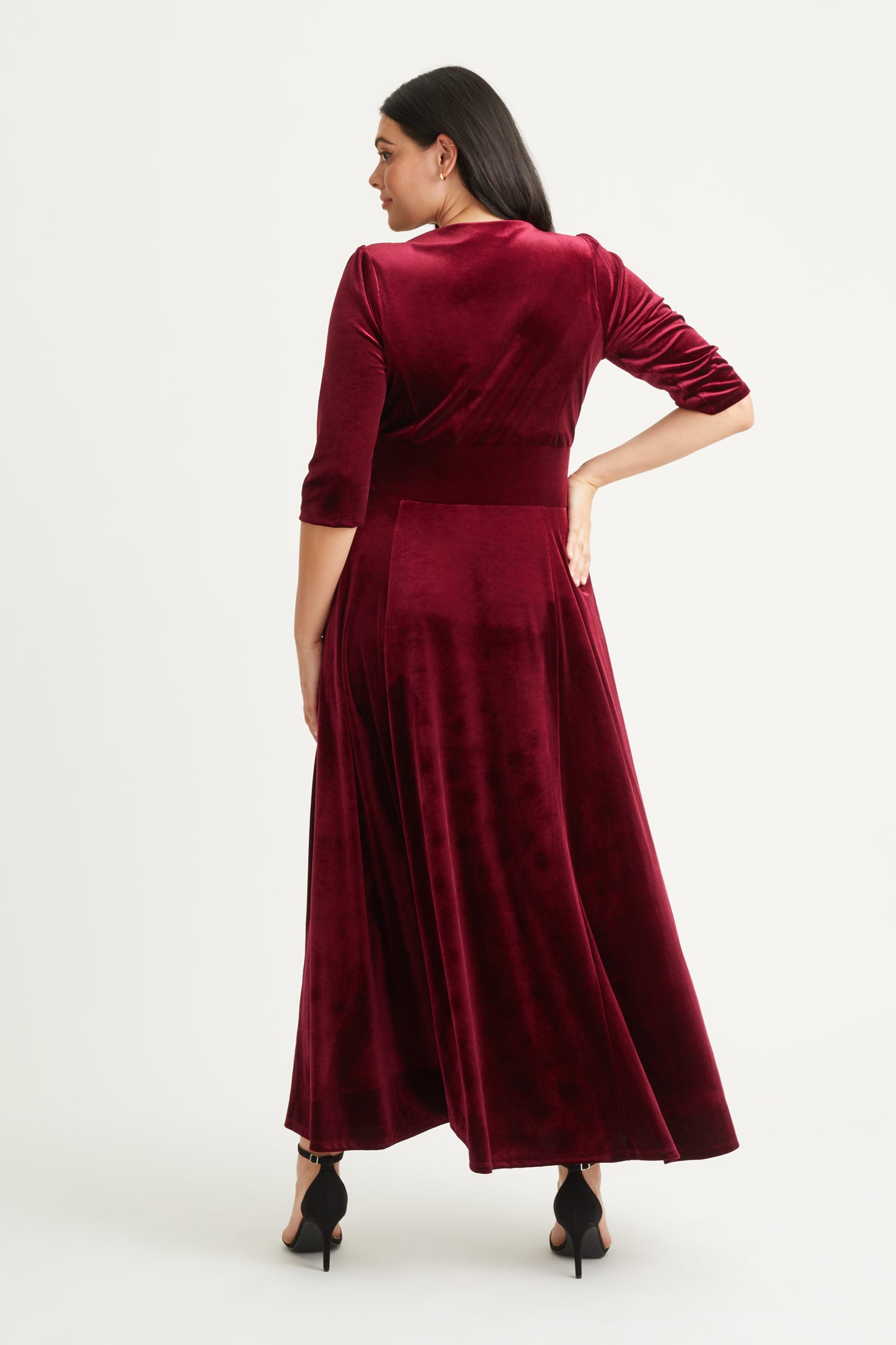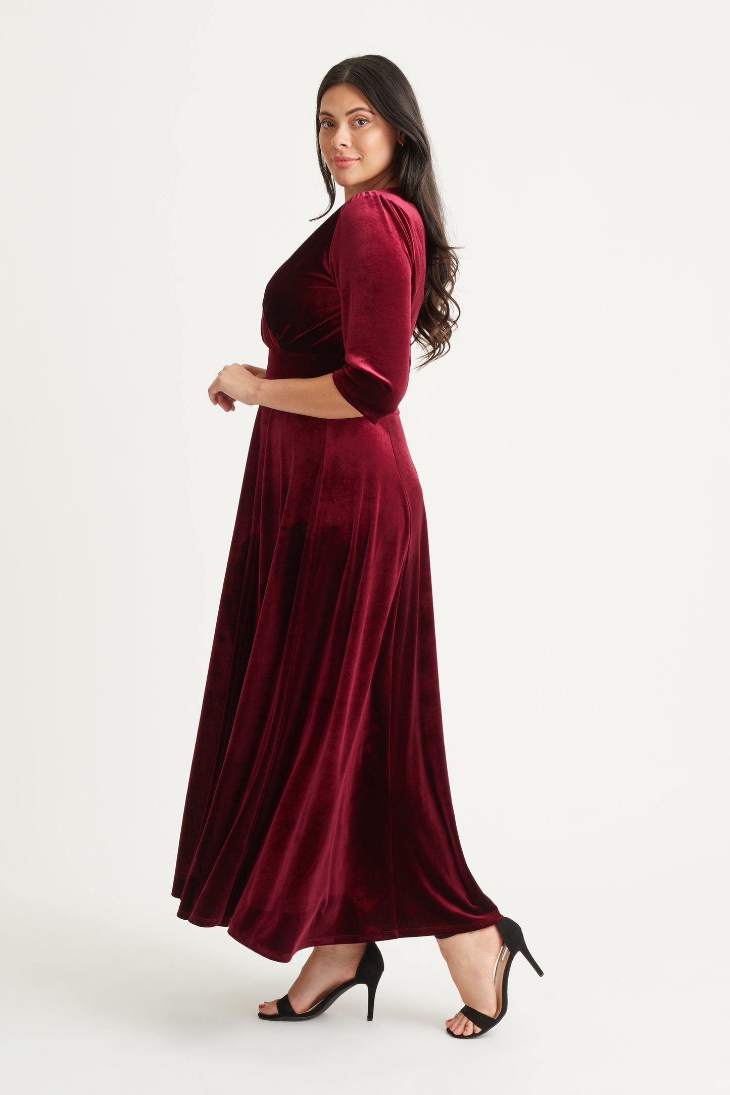 Simple Luxury - A stunning claret velvet maxi gown. This truly beautiful gown is very comfortable to wear. It features a flattering wrap v neck bodice supported by Scarlett & Jo's signature MagicBand® inbuilt waist corset that enhances shape. This gown also features a fully flowing skirt that tapers to swish and swirl. The dress has 3/4 sleeves set into a pretty shoulder line with small detachable shoulder pads, It is a limited edition and is breath-taking as worn. Made in luxury stretch POWERFIT® velvet velour.