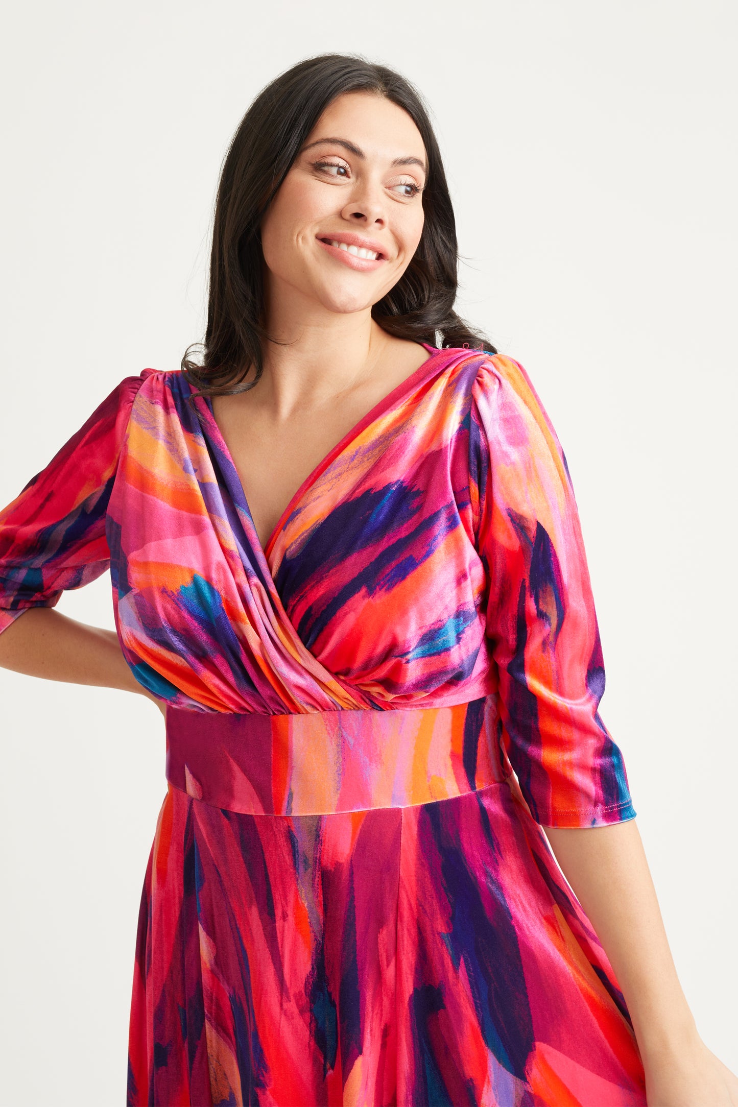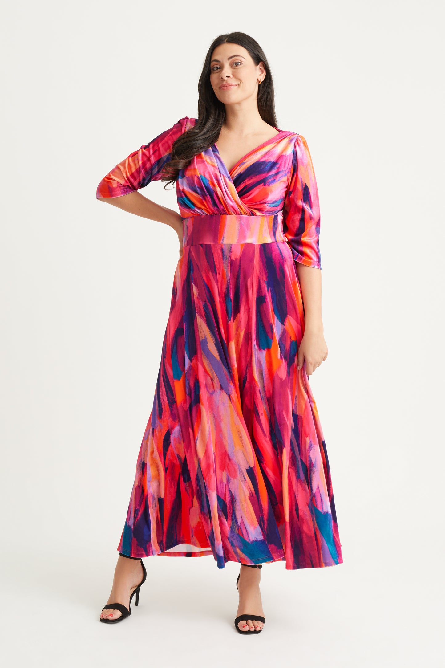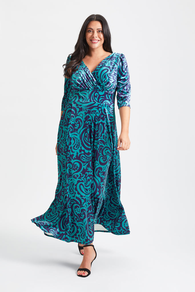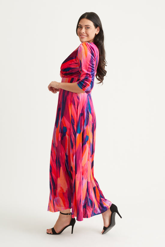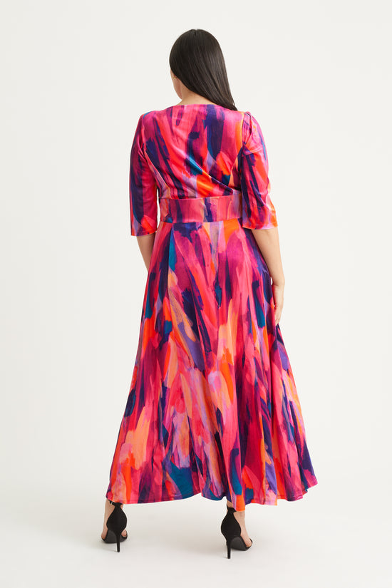 A new take on the Iconic Icarus print, a hot dress in tones of orange and pink with a hint of blue will light up any occasion. This iconic print maxi gown features a flattering wrap v neck bodice supported by Scarlett & Jo's signature MagicBand® inbuilt waist corset that enhances shape. This gown also features a fully flowing skirt that tapers to swish and swirl. The gown has 3/4 sleeves set into a pretty shoulder line with small detachable shoulder pads, It is a limited edition and is breath-taking as worn. Made in luxury stretch POWERFIT® velvet velour.