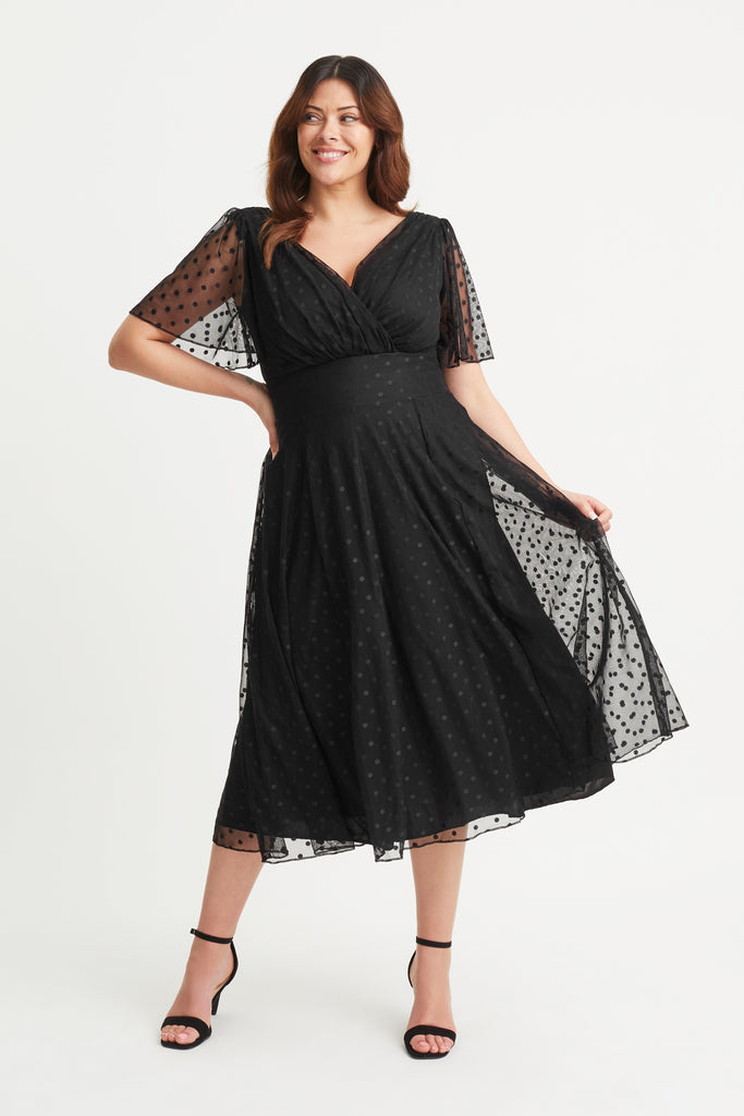 The Victoria Cream Dobby Spot Angel Sleeve Mesh Midi Dress, is designed in a beautiful POWERFIT® mesh - a fabric that breathes. This dress comes with a MagicBand®, built in corset to help accentuate curves and bring out that unique Scarlett & Jo hourglass shape. The deep V-neck wrap creates a flattering feminine silhouette. This timeless fashion piece is fully lined and comes with angel sleeves to cover the upper arms. There are detachable shoulder pads per your preference.