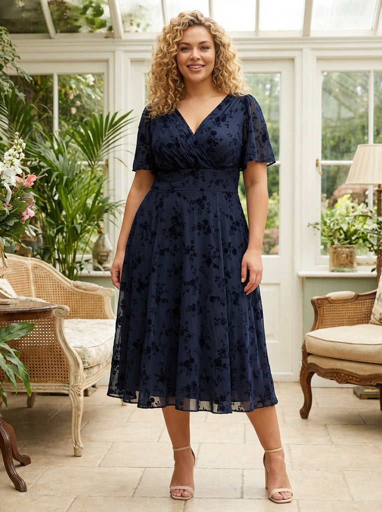 This Angel Sleeve Long Midi Dress is made in a super soft stretch POWERFIT® mesh featuring gorgeous navy velvet ditsy flowers in a fabric that breathes. This dress comes with a MagicBand®, in-built corset to help accentuate curves and brings out that unique Scarlett and Jo hourglass shape. The secure deep V wrap-neck creates a flattering feminine silhouette and the angel sleeves provide upper arm coverage. The dress is fully lined and shoulder pads are detachable. This is a perfect dress that you can wear to any event.