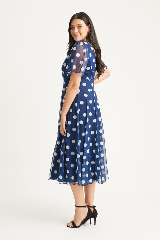Victoria Navy Spot Angel Sleeve Mesh Long Midi Dress