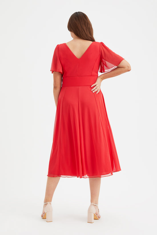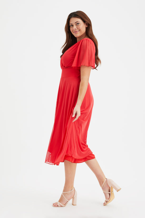 Victoria Solid Scarlet Red Angel Sleeve Mesh Midi Dress